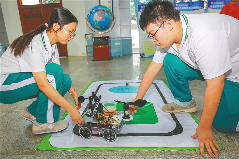 近日,在海南华侨中学高中部科技馆,郭彦宏和刘佳琳向海南日报记者展示了“湿地卫士”创意机器人的运作过程。