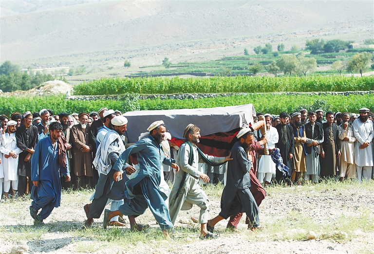阿富汗警方19日说,北约驻阿联军18日在阿富汗东部楠格哈尔省发动无人机空袭,造成18名平民死亡。图为亲友和民众为一名空袭遇难者举行葬礼。 新华社/路透