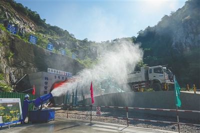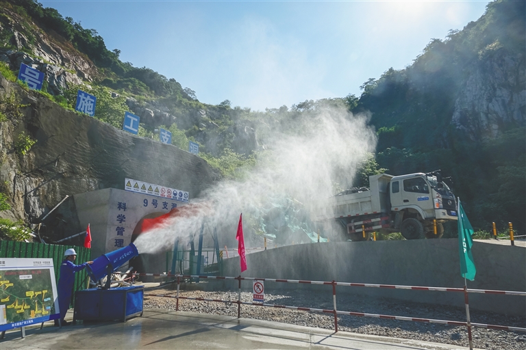 一辆载满开采渣石的运渣车正从洞口缓缓驶出,洞口旁的除尘雾炮机连续不断地喷出水雾,为运渣车除尘降尘,减少污染。这是海南日报记者日前在位于三亚市荔枝岭大春山采石场附近的西水中调工程(一期)9号施工支洞现场看到的场景。