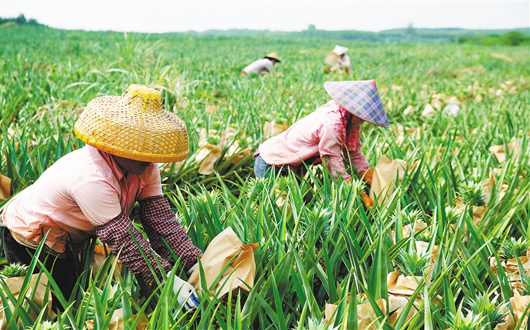 9月17日,几名妇女正在澄迈县红光农场东建队给凤梨套袋,防止阳光暴晒,保证凤梨的品相质量。