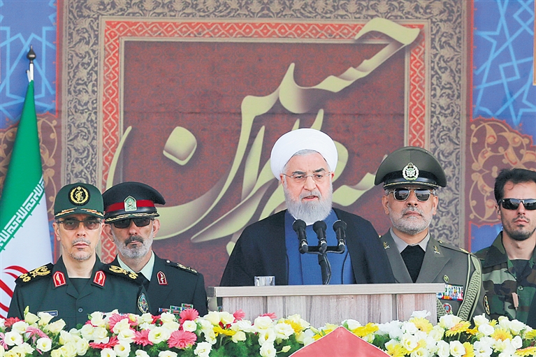 9月22日,伊朗总统鲁哈尼(中)在首都德黑兰出席一场集会活动时表示,伊朗将向联合国大会提交霍尔木兹海峡和平倡议,并抗议企图将地区内发生的一系列事件归罪于伊朗的做法。
