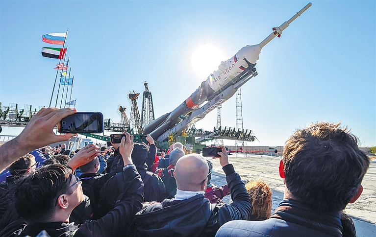 9月23日,在哈萨克斯坦境内拜科努尔发射场,人们观看“联盟MS-15”飞船被立上发射台。