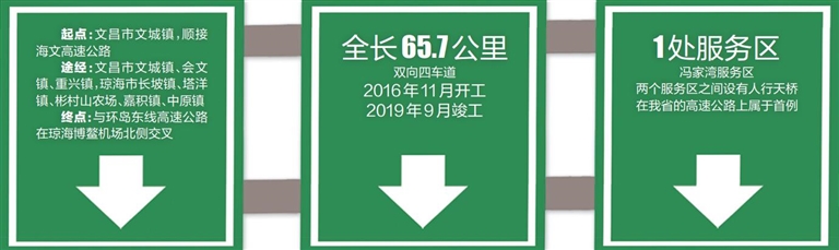 文琼高速起点位于文昌市文城镇,顺接海文高速公路,经文昌市文城镇、会文镇、重兴镇,琼海市长坡镇、塔洋镇、彬村山农场、嘉积镇、中原镇,终点与环岛东线高速公路在琼海博鳌机场北侧交叉,全长65.7公里。项目于2016年11月开工,它的建成将文昌文城镇到琼海博鳌镇的行车时间从70分钟缩短至30分钟。