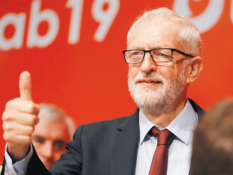 英国最高法院24日做出终审判决,裁定首相鲍里斯·约翰逊要求议会休会五个星期的做法违法。工党领袖科尔宾在工党年会上听完判决结果后竖起大拇指,并发表即兴演说,呼吁约翰逊遵守法律、放弃“无协议脱欧”、提前举行大选。新华社发