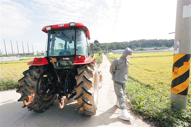 在韩国坡州,检疫部门工作人员在一个农场附近巡逻。