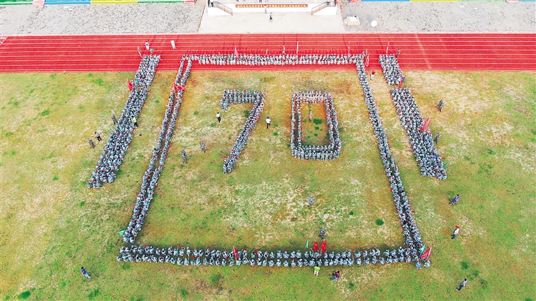 9月23日早上,在儋州市白马井中学的升国旗仪式中,新生们摆出“70”的造型,庆祝新中国成立70周年。