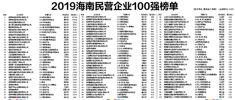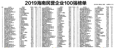 2019海南民营企业100强榜单