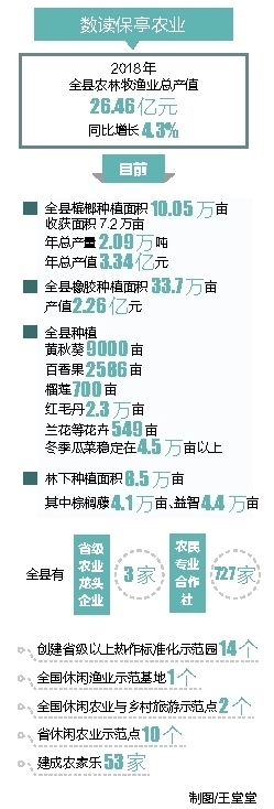 如今,保亭特色农业多点开花,红毛丹、百香果、黄秋葵、山竹、芒果、莲雾等产业不断做优做强;2018年全县水稻种植面积约4.7万亩,亩产比70年前翻了几番;冬季瓜菜的种植面积稳定在4.5万亩以上,年产量达到6.64万吨;水果仅红毛丹一项年产量就有1.85万吨。