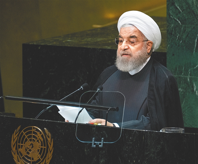 9月25日,在位于美国纽约的联合国总部,伊朗总统鲁哈尼在联合国大会一般性辩论上发言。