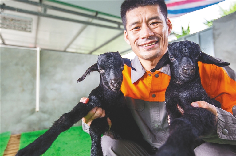 9月26日上午,海南日报记者来到保亭加茂镇共村,穿过一片茂密的橡胶林地,来到一片场房。未走进去,就听见“咩咩咩”的山羊叫声。“这就是我们村的黑山羊养殖基地。”该村村委会副主任黄大杰笑着说道,这里可不仅仅是养羊,“你看看能不找出什么不同。”