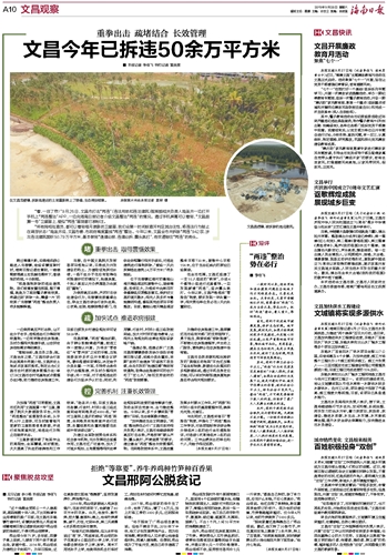 为建立全面防控责任体系和社会参与机制,充分发挥社会监督作用,文昌市还广泛宣传,加大了对城乡规划、土地管理等相关法律法规知识和政策的宣传解读力度,发动全民自觉参与、合力推进整治。今年以来,多个乡镇实现“零增长”目标,生态修复稳步推进。