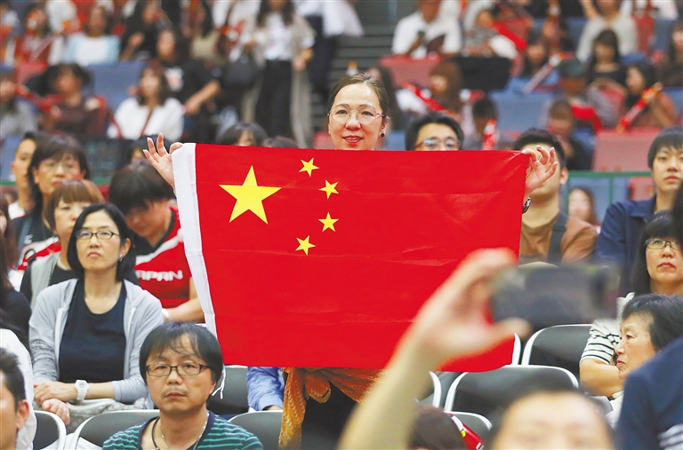 9月28日,中国队球迷手持国旗庆祝比赛胜利。