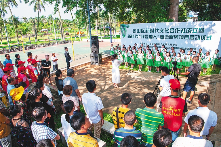 琼山区被确定全国新时代文明实践50个试点单位之一后,琼山区充分发挥党委的领导核心作用,守正创新,全力以赴做好试点工作,着力在应众需、破众难、汇众智、集众力、为众享上下功夫,创新探索了试点“1+365”模式。不仅如此,在农村基层宣传思想文化工作和精神文明建设方面,琼山区创新地通过开展“益·老爸茶”志愿服务宣讲活动、创立“小喇叭”志愿服务队伍、打造“琼戏台里有讲堂”志愿服务等项目,整合本土宣讲队伍,通过本地话语言,以老爸茶店、田间地头等作为传播点,宣讲红色故事、传统文化以及党的最新理论政策,使党的理论政策以通俗易懂的语言进入寻常百姓家。