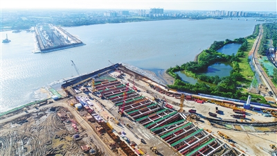 “最深处要下挖20多米,高峰期工地上有1000多名工人同时作业。”站在二期围堰的挡板强上,该项目相关负责人严啸坤说,作为海口主城区通往江东新区的重要通道之一,文明东越江通道项目每天都在争分夺秒加速建设,助力江东新区建设。