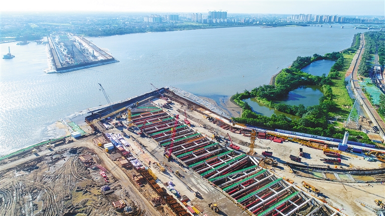 数十台履带吊机和桩机组犹如一道铁堤拦江而起,近百辆卡车来回地奔跑,将一车又一车泥沙运走,在海口文明东越江通道项目工地上,这样的忙碌景象每天都可以看到。