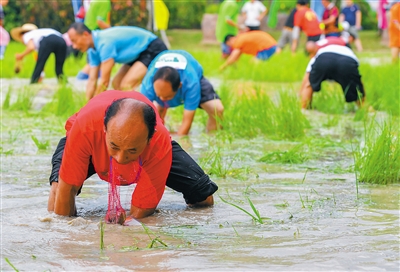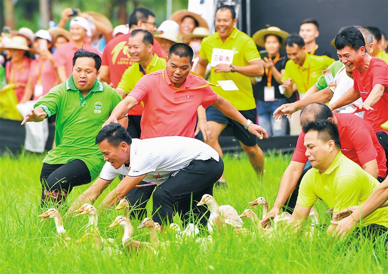 脱掉鞋子、卷起裤腿、摩拳擦掌……9月23日,在三亚亚龙湾国际玫瑰谷里,数百名准备冲进田里的农民们,不是抢着收稻子、收果子,而是抢着捉泥鳅捉鸭子。2019年“中国农民丰收节”海南庆祝活动设置的“喜乐丰收·海南农民趣味运动会”,吸引了众多农民参与,现场热闹非凡、欢笑不断。