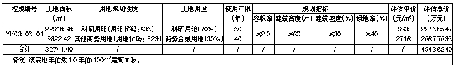 一、挂牌出让宗地基本情况和开发建设要求:(一)挂牌出让宗地基本情况:本次挂牌出让宗地位于三亚崖州湾科技城控规YK03-06-01地块,CGCS2000国家大地坐标系面积32741.40平方米(海南平面坐标系面积32713.63平方米)。用地四至及界址坐标详见地块勘测定界图。该宗地规划用地性质为科研混合其他商务用地。其中,科研用地占70%,CGCS2000国家大地坐标系面积22918.98平方米(海南平面坐标系面积22899.54平方米);商务金融用地占30%,CGCS2000国家大地坐标系面积9822.42平方米(海南平面坐标系面积9814.09平方米)。2019年9月18日,三亚市人民政府以《关于深海科技城起步区YK03-06-11等地块用地具备净地出让条件的证明》证明控规YK03-06-01地块土地征收及“两公告一登记”工作已完成。三亚市崖州区人民政府已与被征地单位签订了《征用土地补偿协议书》,土地补偿款、安置补助费、青苗补偿费和地上附着物等款项已支付到位,相关征地材料现存于崖州区人民政府。目前地块上的附着物已清表、无法律经济纠纷、土地开发利用规划条件明确、符合土壤环境质量要求。地块周边可以满足施工建设所需的水、电供应,相关设备、机械可以进场施工。该宗地具备净地出让的条件。该宗地概况及规划指标等情况详见下表: