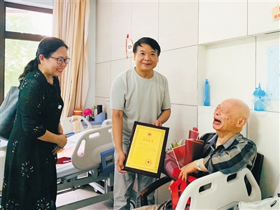 9月26日上午,省作协相关负责人梅国云和王雁翎代表中国作协给云逢鹤先生送去证书和鲜花。91岁的云逢鹤在医院里疗养,言语的表达有些吃力,但意识一直十分清楚。在接受证书和鲜花时,老人很是激动,连用中英文说着“谢谢”,热泪盈眶,令人动容。当天,海南日报记者采访了云逢鹤先生的儿子云沐,云逢鹤先生在旁边就座,听到他熟悉的人和事时,老人会咧开嘴笑,偶尔还发出几声不甚清晰的愉悦的词句。