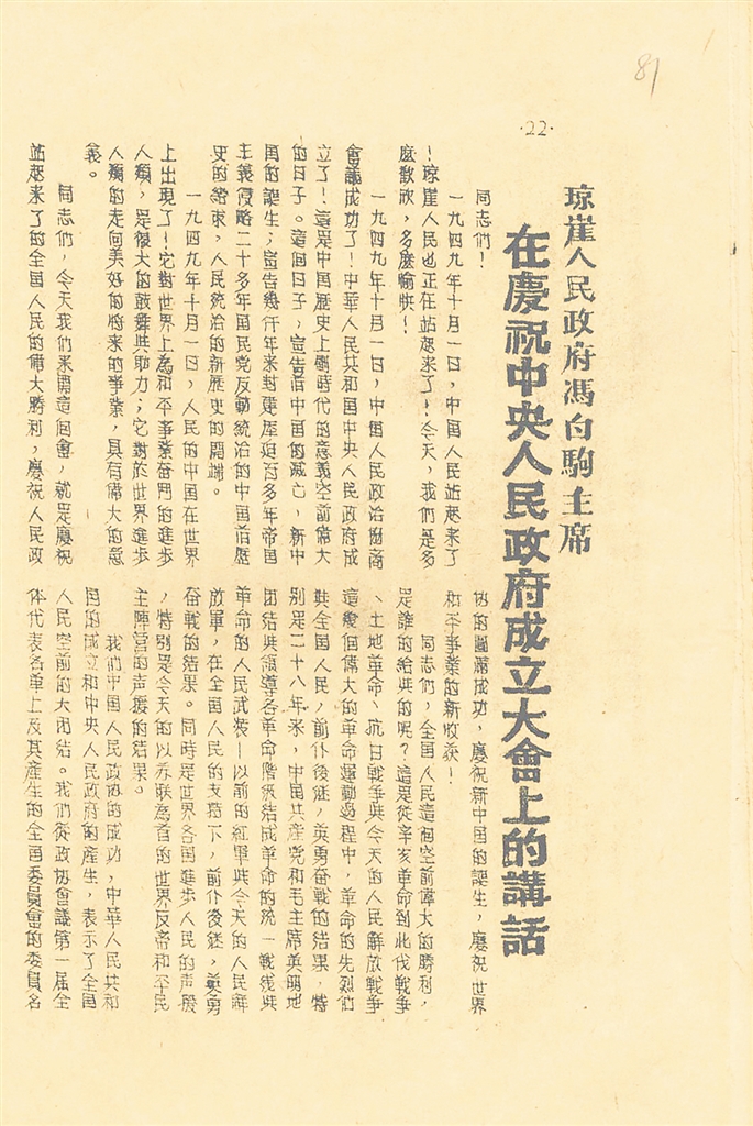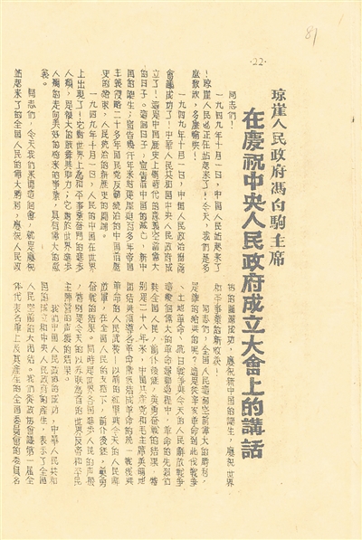 早上8点,一千多人参加的庆祝大会正式开始。庆祝会主席台正中央挂着一面巨幅五星红旗,旗帜的两边分别挂着毛泽东和孙中山的巨幅画像。琼崖党政军领导人分别上台发表讲话。从《新民主报》当时刊登的《琼崖人民政府冯白驹主席在庆祝中央人民政府成立大会上的讲话》中可以看到,冯白驹在讲话中号召琼崖军民在中共中央、毛泽东主席的领导下,团结奋战,抗击败逃来琼的国民党军队,并指出:我们现在虽然是孤军作战,但我们的斗争从来都不是孤立的,解放了华南的人民解放军野战兵团一定会来支援我们,岛上的残兵一定会被消灭,胜利的曙光一定会照亮琼崖的每一个城镇乡村。