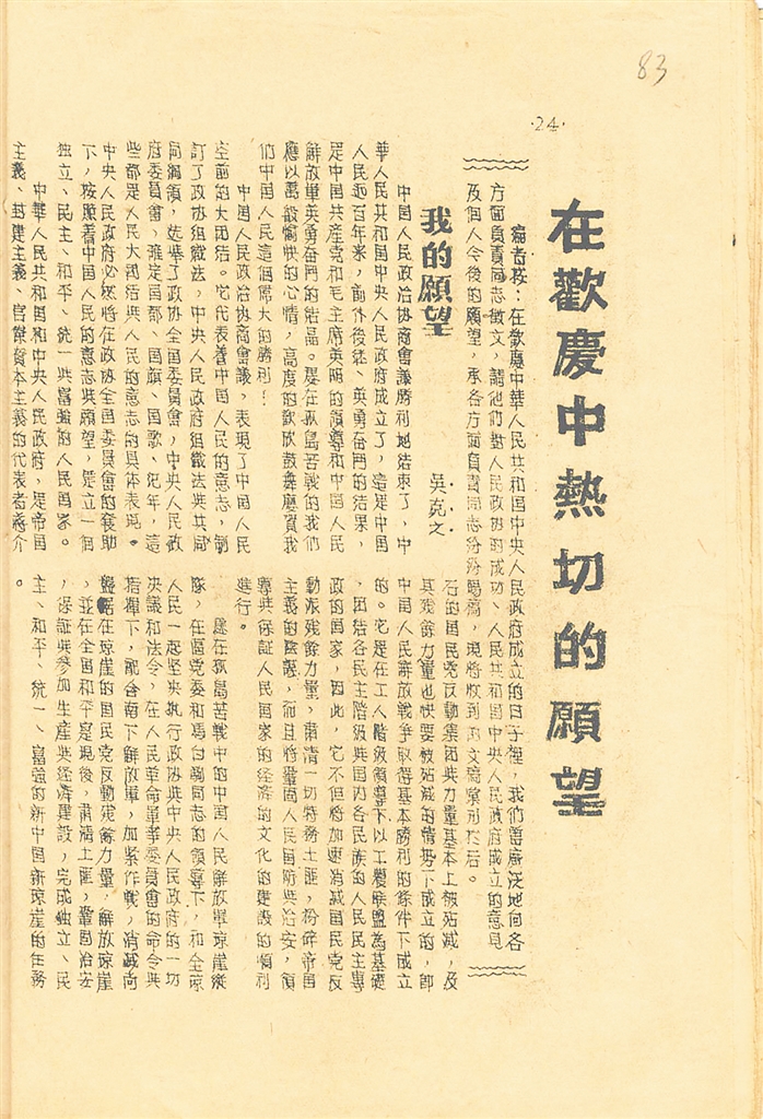 琼纵副司令吴克之在《新民主报》上发表了他的征文《我的愿望》,文中写道:还在孤岛苦战中的中国人民解放军琼崖纵队,在区党委和冯白驹同志的领导下,和全琼人民一起坚决执行政协与中央人民政府的一切决议和法令,在人民革命军事委员会的命令与指挥下,配合南下解放军,加紧作战,消灭尚盘踞在琼崖的国民党反动残余力量,解放琼崖,并在全国和平实现后,肃清土匪,巩固治安,保证参加生产与经济建设,完成独立、民主、和平、统一、富强的新中国、新琼崖的任务。