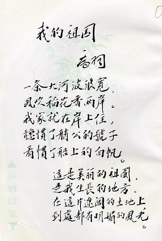 每个人心中都有许多关于祖国的图景,但是在大部分人心中,祖国一定是那个有一条大河,河里翻涌着波浪,河岸稻花飘香的地方,这幅图就来自著名歌曲《我的祖国》,在这首由乔羽作词、刘炽作曲的歌中,一开始就为我们描绘了一个富饶、美丽而又祥和的祖国。这是美丽的祖国,这是英雄的祖国,这是强大的祖国,我们用美酒招待朋友,同时毫不犹豫地向豺狼举起猎枪。