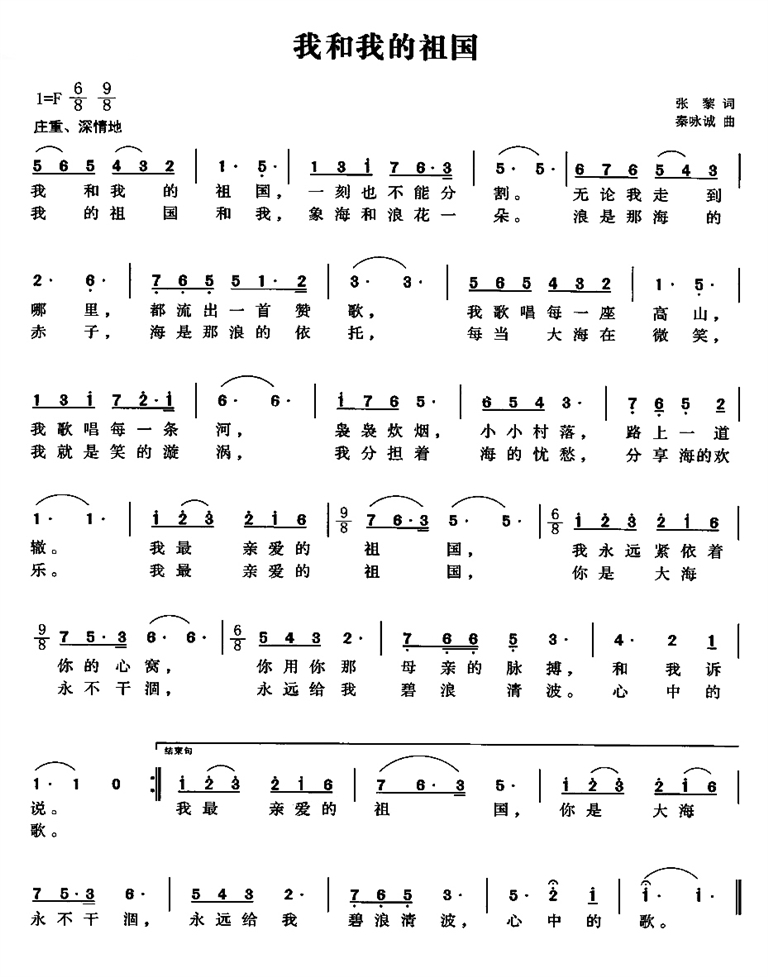也许是时代的浪潮激荡了秦咏诚的心,在作曲家笔下,一个个音符仿佛涌出来一样,迅速占领了稿纸,不到半个小时,一首新歌就谱好了,歌曲中运用了大量复调和对位,情感线索也不断升华,抒发了作曲家对祖国的爱。甫一写好,两人就知道一首足以称之为经典的歌曲诞生了,这段优美的旋律几乎震惊了张藜,在他眼中,新乐曲无论抒情性还是表现力都更胜《海滨音诗》一筹。