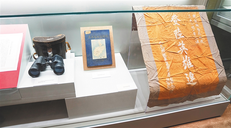 “屹立东方”作为该展的开篇,回顾着1949年以来,新中国的“蹒跚起步”。在1950年的节点下,一张“海南岛战役中登陆部队抢占滩头阵地”的黑白照片、一本蓝色封面的《海南岛战役总结》、一面褪色的“解放海南岛战役三五二团一营三连‘登陆英雄连’”旗帜,多件珍贵文物再现海南岛红色革命峥嵘路。