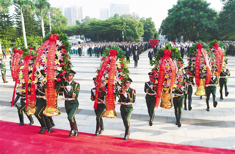 碧空如洗,松柏如肃,金牛岭解放海南岛战役烈士陵园里,鲜艳的五星红旗猎猎招展。在举国欢庆新中国成立70周年的时候,人们更加铭记为新中国建立、民族解放和人民自由忘我牺牲的英雄。省委,省人大常委会,省政府,省政协,省军区,各民主党派、省工商联和无党派人士,各人民团体,各界群众,少先队员敬献的9个花篮在纪念碑前一字排开。