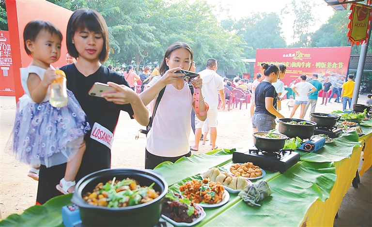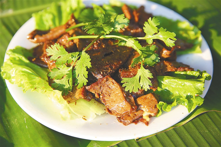30日17时许,本次美食节正式拉开帷幕。在“完美呈鲜”美食展示区,摆放着仙沟牛肉、仙屯鸭、菜包饭、坡寨羊等20多种定安特色美食,供市民游客品鉴或拍照。“仙沟牛肉的肉质鲜嫩,由于刚宰杀的缘故,牛的神经还在‘跳动’,也被称为‘会跳舞的牛肉’。”来自海口的陈杰说,他经常到仙沟吃牛肉,无论是涮牛肉,还是香煎牛肉,都非常美味。
