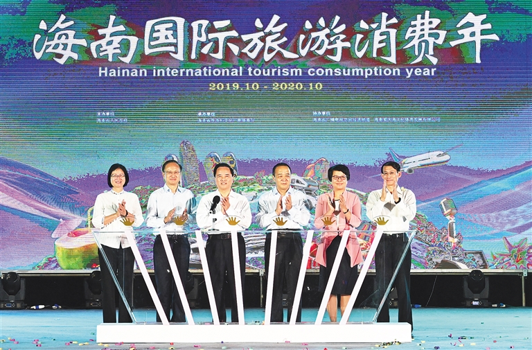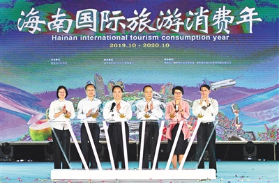 节日里的星光大道,璀璨的灯光照亮夜空,国内外游客欢声阵阵,处处洋溢着一片喜庆祥和的国庆节日氛围。欢快的海南风情歌舞拉开了启动仪式的序幕。在现场500多名市民和游客的见证下,刘赐贵等省领导共同按下按钮,启动五彩缤纷的激光灯矩阵,标志着从今年10月1日至2020年9月30日,为期一年的海南国际旅游消费年活动在我省各部门、各市县正式全面启动。