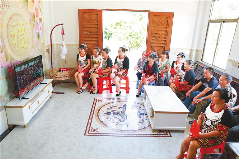 10月1日,在琼中黎族苗族自治县营根镇朝参村,黎族群众在家里观看庆祝中华人民共和国成立70周年大会电视直播。