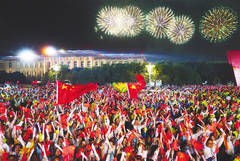 10月1日晚,天安门广场火树银花、流光溢彩。习近平等党和国家领导人来到天安门城楼,同各族各界群众联欢,共祝新中国70华诞。