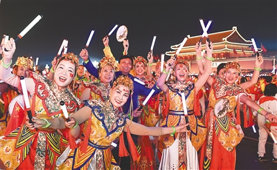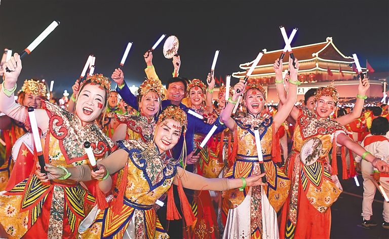 广场上,嘹亮的歌声、轻快的舞步、灿烂的笑容、热烈的欢呼,尽情释放着发自内心的共同澎湃——
