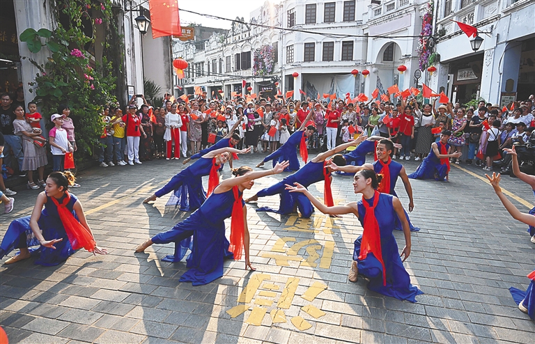 鲜花装饰的墙面,干净整洁的路面,随处可见的雕塑,古色古香的南洋风格建筑,欢声笑语不断的市民游客……10月3日,海口骑楼老街充满了欢快的国庆假日氛围。老街今年国庆新开放了海口非遗文化展示馆、骑楼剧院,还组织了琼剧等文化展演,积极推进文旅融合,让市民游客共享文化大餐。