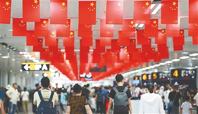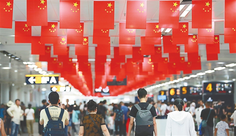 10月2日,海口美兰国际机场满眼都是国旗,为国庆营造热烈喜庆、欢乐祥和的氛围。
