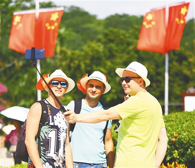 10月3日,外国游客在三亚南山景区参观游览。
