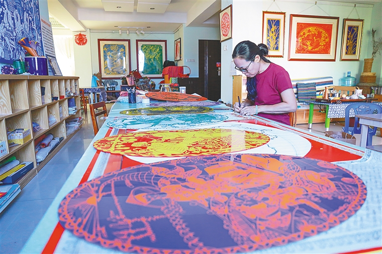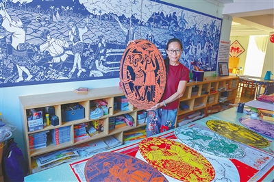 “剪纸属于镂空艺术,不允许出错。这也意味着我们要在动用剪子、刻刀前,做好构思设计、绘制纹样等一系列繁复的准备工作。”黄小娜直言,因为自己和黄海桃都是汉族人,且均生长于海南岛,一开始,对岛外许多民族的生活习惯、风土人情并不熟悉,给创作带来了很大的困扰。此外,因为白天要上课,两位教师只能在夜里挤出时间,废寝忘食地展开创作、交流。