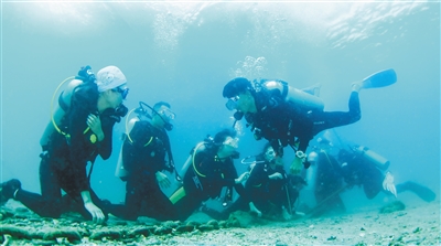 10月6日,在陵水分界洲岛旅游区,参加PADI潜水课程培训的游客在学习潜水。 本报记者 武威 特约记者 童国强 摄