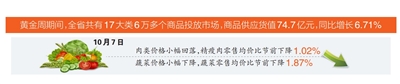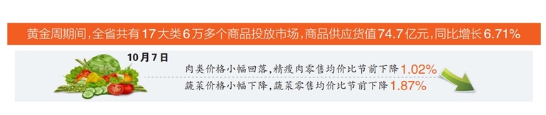 黄金周期间,我省消费品备货充足,生活必需品市场运行平稳。各大型商场、超市、旅游景点等主要消费场所节日氛围浓郁、商品需求旺盛、市场秩序良好。