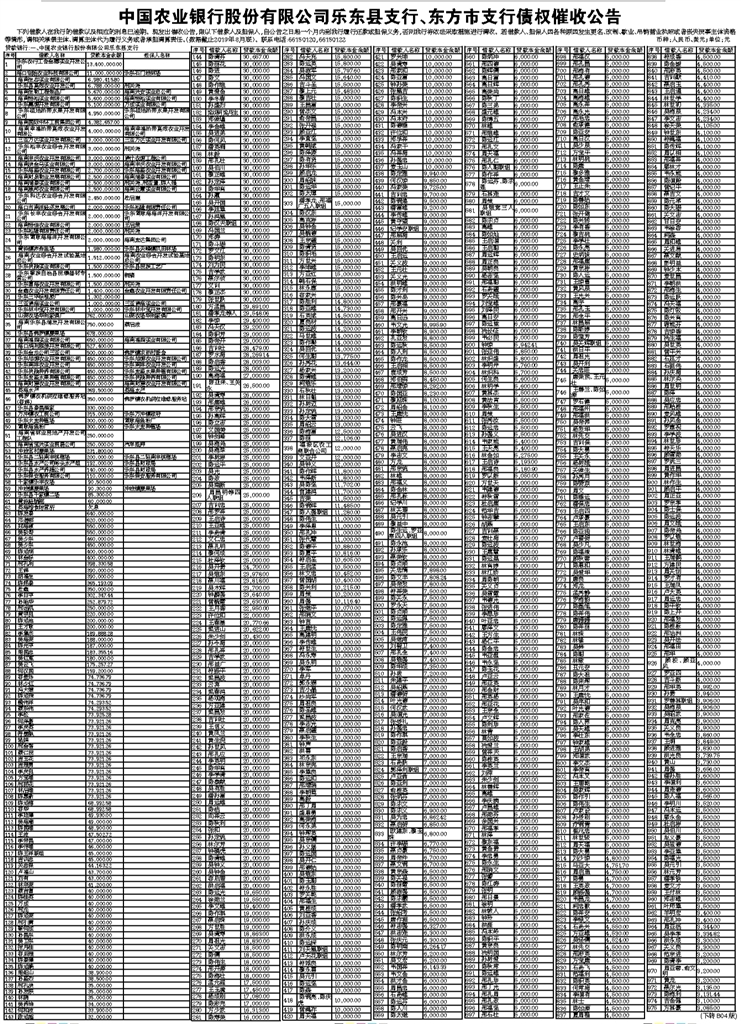 中国农业银行股份有限公司乐东县支行、东方市支行债权催收公告