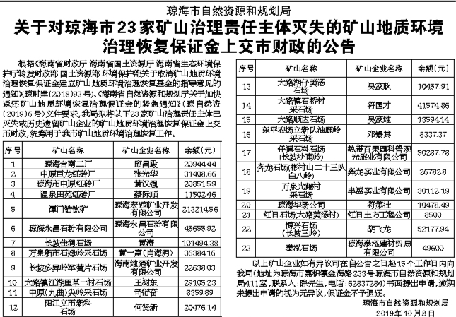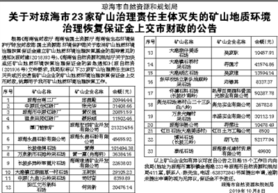 关于对琼海市23家矿山治理责任主体灭失的矿山地质环境治理恢复保证金上交市财政的公告