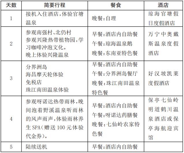 三亚湾体验中医理疗→保亭呀诺达雨林文化旅游区→泡野溪温泉、体验雨林养生SPA→陵水分界洲岛→琼海北仍村→琼海龙寿洋万亩田野公园→琼海官塘体验田园温泉→海口华谊冯小刚电影公社