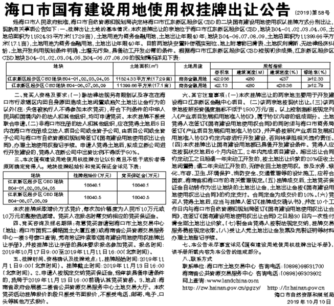 海口市国有建设用地使用权挂牌出让公告