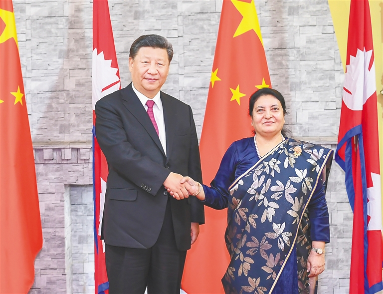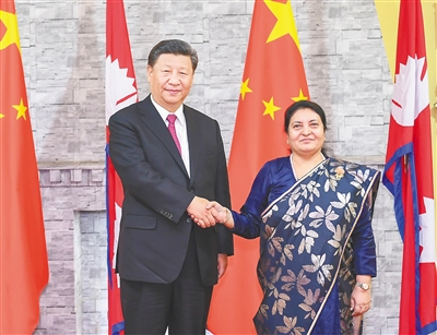 习近平指出,今年4月在北京,你盛情邀请我年内访问尼泊尔。我今天如约而来。正如总统女士所说,中尼之间只有友好和合作。在机场和沿途欢迎人群的脸上,我看到了尼泊尔人民真诚的笑容,感受到了他们对中国人民发自内心的友好,让我再次感受到中尼友好在尼泊尔拥有广泛共识和扎实根基。中尼两国人民心意相通、休戚与共,是邻国友好交往的典范。我希望通过这次访问,传承中尼传统友谊,顺应两国人民期待,推动两国关系更上一层楼。