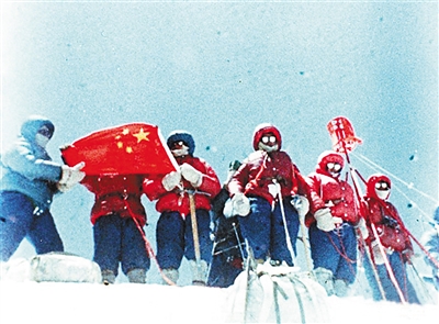1975年5月27日早晨,9名中国登山队队员离开海拔8680米的突击营地向顶峰挺进。经过六个半小时的不断攀登,他们在5月27日14时30分用无线电报话机向登山队大本营报告了登顶喜讯。队员们在珠峰峰顶展开了鲜艳的五星红旗,竖立了一个写有“中华人民共和国登山队”字样的3米高的红色金属测量觇标,并拍摄了顶峰的照片和影片。成功登顶后,国家测绘地理信息局开展了首次珠峰海拔高程精确测量,测定珠峰海拔高程为8848.13米。