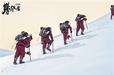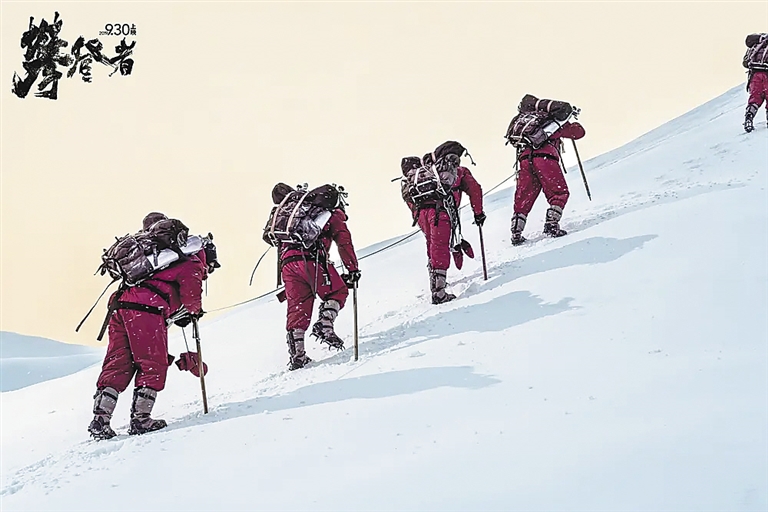 “每寸冰霜,每寸锋芒,每一步都是信仰……登上绝顶,只为国旗飘扬。” 电影同名主题曲《攀登者》描绘了两代中国登山队员成功登顶背后的艰辛。