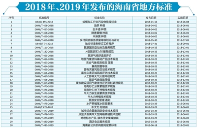 2018年,省标准化行政主管部门根据《中共中央 国务院关于支持海南全面深化改革开放的指导意见》关于我省“研究构建绿色标准体系”的要求,在国家市场监管总局和中国标准化研究院的大力支持下,与省内相关部门通力合作,通过深入调查研究,认真分析梳理,广泛征求意见,初步研制构建起了海南绿色标准体系,形成了《海南省绿色标准体系框架》《海南省绿色发展标准明细表》《海南省绿色标准体系重点标准研制清单》等3个技术文件,其中标准体系框架由“基础与管理、空间布局优化、绿色经济发展、生态环境保护、绿色文化生活、绿色政务与公共服务”等6个方面多层级的标准子体系构成;标准明细表是标准体系框架的具体化,收录有国家标准、行业标准、地方标准1800余项;重点标准研制清单是需要组织制定的绿色发展地方标准的具体项目。为了确保绿色标准体系构建之后的有效实施和不断完善,今年3月海南省质量强省工作领导小组印发了绿色标准体系建设三年实施方案,5月22日又召开专题会议进行了全面部署。