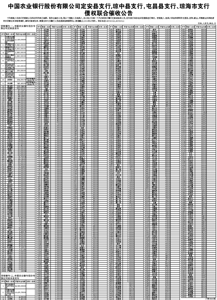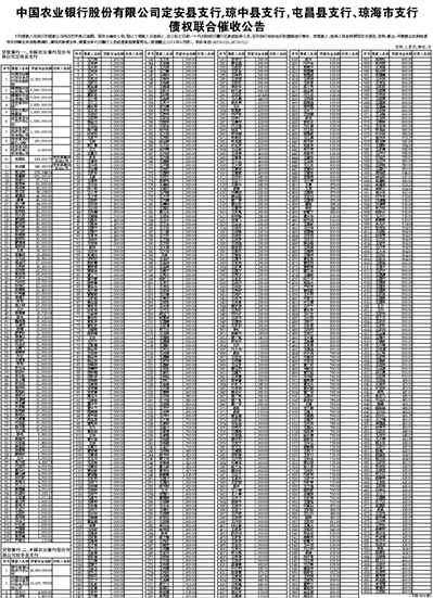 中国农业银行股份有限公司定安县支行,琼中县支行,屯昌县支行、琼海市支行债权联合催收公告