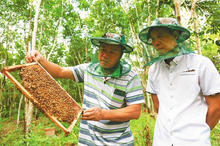 都说“人穷志短”,没了穷帽子,我发展产业的信心也越来越足。攥着卖槟榔挣来的这桶金,我一口气承包了好几片林地,种下200余株菠萝蜜,买来27箱蜂种,又拉回30多头猪苗,一边学技术一边干,迈起长短结合的产业发展路子。
