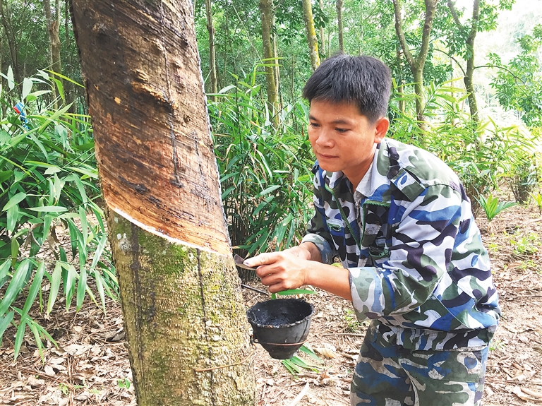 我认真地算过这笔账,按每株橡胶每年割胶3.5公斤来算,我家里那400多株已经开割的橡胶每年至少可产干胶1500公斤,按照每公斤10元钱的收购价来算,我家每年割胶至少能入账1.5万元,去年已经实现脱贫摘帽了。
